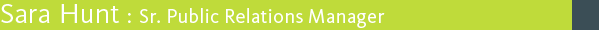 A crafty wordsmith and media relations expert, Sara Hunt joined the Touch Points team in mid-2007. In fact, she and Jennifer have worked together several times over the past 10 years or more. As an accomplished writer, special events planner and communications coordinator, Sara has worked on national Public Relation campaigns for several well-known consumer brands. She was one of the team members involved with executing the year-long 50th anniversary celebration of the nation's leading aluminum foil brand, which won the national Best of Silver Anvil award from the Public Relations Society of America. Also, she been involved with change management communications for a national financial institution, along with planning and scheduling events to help define and enhance the change management experience for hundreds of employees.