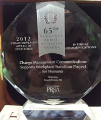 Touch Points wins an Award of Excellence Touch Points won an Award of Excellence in the 2012 Virginia Public Relations Awards competition sponsored by PRSA Richmond. The entry, "Change Management Communications Supports Workplace Transition Project for Humana," took First Place in the Internal Communications category for campaigns. Touch Points provided comprehensive change management support for Humana's workplace transition project in Charlotte during 2011. Along with a strategic communications plan, Touch Points also created a series of newsletters and e-mail updates to keep associates informed and engaged throughout the transition process. |